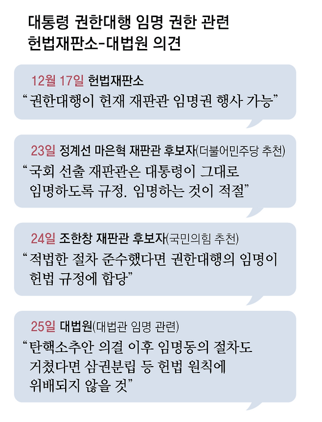 하지만 헌법재판소는 이미 “한 권한대행이 헌법재판관에 대한 임명권을 행사할 수 있다”고 밝혔다. 국민의힘에서 추천한 조한창 헌법재판관 후보자를 포함한 후보자 3명도 국회 인사청문회에서 “적법한 절차를 거쳤다면 한 권한대행이 헌법재판관을 임명하는 것이 헌법 규정에 부합한다”는 입장을 내놨다.