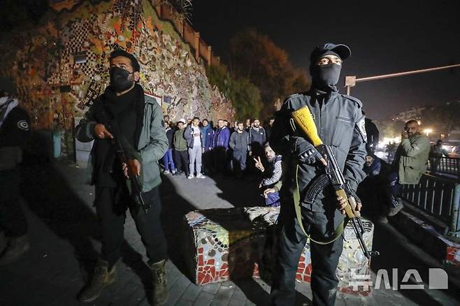 [다마스쿠스=AP/뉴시스] 25일(현지시각) 시리아 과도정부의 보안군이 다마스쿠스 마제 지구에서 알라위파 시위대 주변을 경계하고 있다. 소수 집단인 알라위파는 시아파 이슬람의 분파로 바샤르 알아사드 전 대통령이 속한 종파다. 아사드 독재정권이 무너지면서 과도정부가 구성됐지만, 아사드 정권 지지자들의 저항이 일부 이어지고 있는 것으로 전해진다. 2024.12.26.