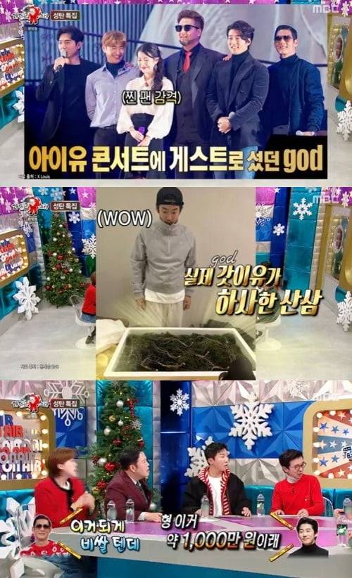 박준형은 아이유에게 선물을 받았다며 "우리가 아이유 콘서트에 게스트로 나간 적이 있다. 그때 아이유가 고맙다고 명품 선글라스와 산삼을 줬다"며 "산삼을 보고 윤계상이 '형, 이거 가격이 1000만원 정도래'라고 하더라"고 해 놀라움을 안겼다. 멤버 각자에게 모두 줬기에 산삼 가격만 5000만원을 호가했다.