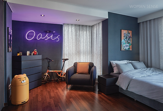 “지인들이 왜 방송 안 하냐고 질문하는데 아직 방송되지 않아서 그렇지 계속 쉬지 않고 촬영 중이에요. 시청자들이 바라는 밝은 오나라를 연기하려고도, 제 안에 있는 진지함을 연기하려고도 노력 중이고요. 이번에 리모델링하면서 트로피를 자랑스럽게 꺼내놓을 수 있는 진열장을 짰는데요, 트로피들이 제자리를 찾아서 너무 좋아요. 나, 이렇게 열심히 일했다고 보여줄 수 있는 공간이어서 뜻깊고요.” 완벽하게 쉬기 위해 침실은 최대한 코지하게 꾸미면서도 따스한 색감을 더했고, 게스트룸은 마치 영화 세트장처럼 포인트를 줬다. 배우 오나라가 사는 집은 영화처럼 스토리가 있고, 그래서 애착이 느껴진다.
