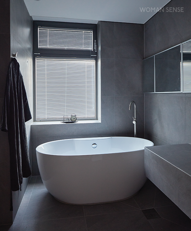 “원래 성격이 즉시, 직접! 해야 직성이 풀려요. 처음 리모델링을 계획하고 안 쓰는 물건을 중고 거래 앱에 올려 파는 것부터 그림 걸 레일 설치하는 것까지 제 손으로 하나하나 해나가는 즐거움이 있더라고요. 중고 거래할 때 마스크를 쓰고 가도 목소리만 들으면 저인 줄 다 아시더라고요. 발품도 무지 팔았는데 온라인에서 보고 맘에 든 욕조는 부산까지 내려가서 직접 보고 샀어요. 제가 인테리어 전문가가 아니다 보니 조명, 가구 등이 우리 집에 잘 어울릴까는 물론이고 서로 조화로울지에 대한 고민이 많았어요. 집 정리를 의뢰한 공간치유 윤주희 대표님이 홈 스타일링을 도와주셨는데 큰 도움이 됐어요.” 그동안 알파룸이 죽은 공간이었는데 어디에서나 시선이 가는 루이스폴센 조명을 단 개인 서재 공간으로 완성해 대본 연습 등 많은 일을 이곳에서 하게 됐다. 김미네 작가의 작품 ‘NOBODY’s idea : Desserts’와 ‘NOBODY with chanel’을 나란히 걸어 갤러리 같은 분위기가 난다.