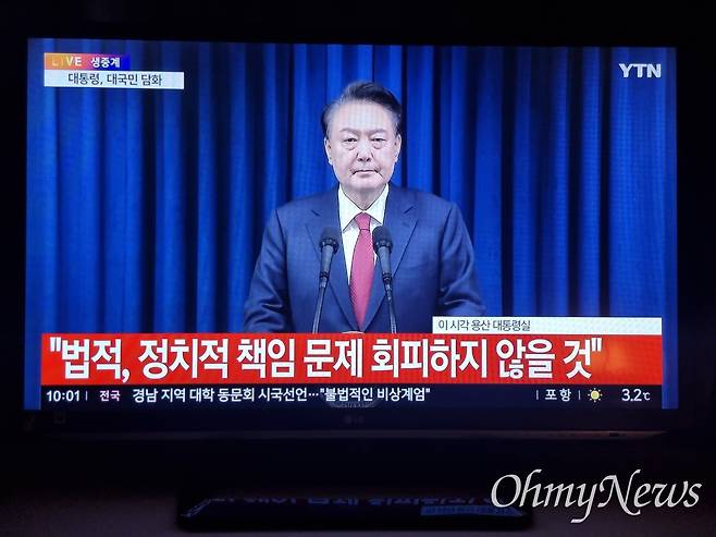 | ▲ 윤석열 대통령 비상계엄 대국민 담화 "법적-정치적 책임 회피 않을 것" 윤석열 대통령이 7일 오전 10시 대국민 담화를 통해 "계엄으로 국민께 불편을 드려 진심으로 사과"드리고 "법적-정치적 책임 문제를 회피하지 않을 것"이라고 밝히고 있다. 또 윤 대통령은 본인의 임기를 포함해 정국 안정방안은 당에 위임할 것"이라고 말했다. |