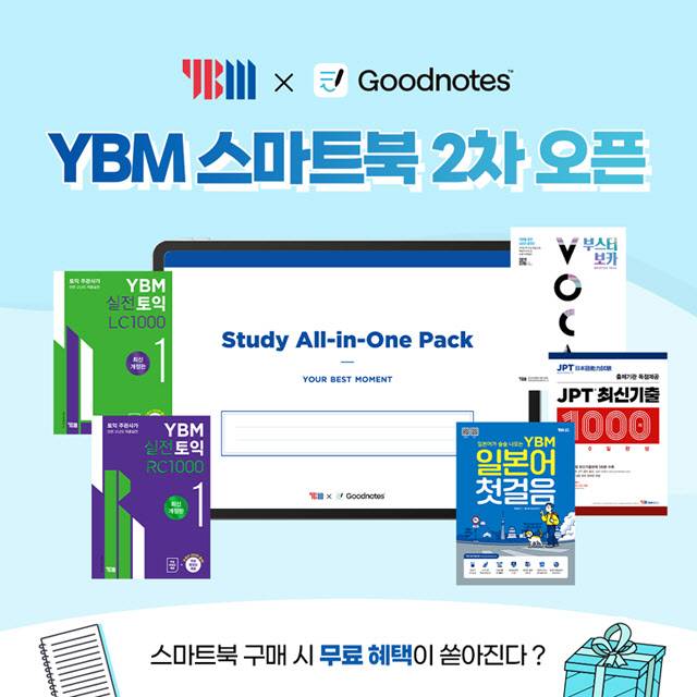 YBM AI 스마트북 구매자에 한해 YBM 학습 스티커(78종)와 YBM과 굿노트의 공식 디지털 굿즈인 ‘Study All-in-One Pack’이 추가 제공된다. 굿노트의 ‘Ask Goodnotes’ 서비스도 이용할 수 있다. Ask Goodnotes는 AI를 기반으로 한 일종의 학습 챗봇으로 △학습중인 교재의 핵심 내용을 요약 △질문 답변 △퀴즈 문제 출제 기능을 제공한다.