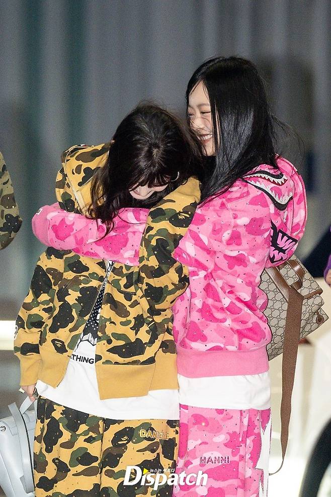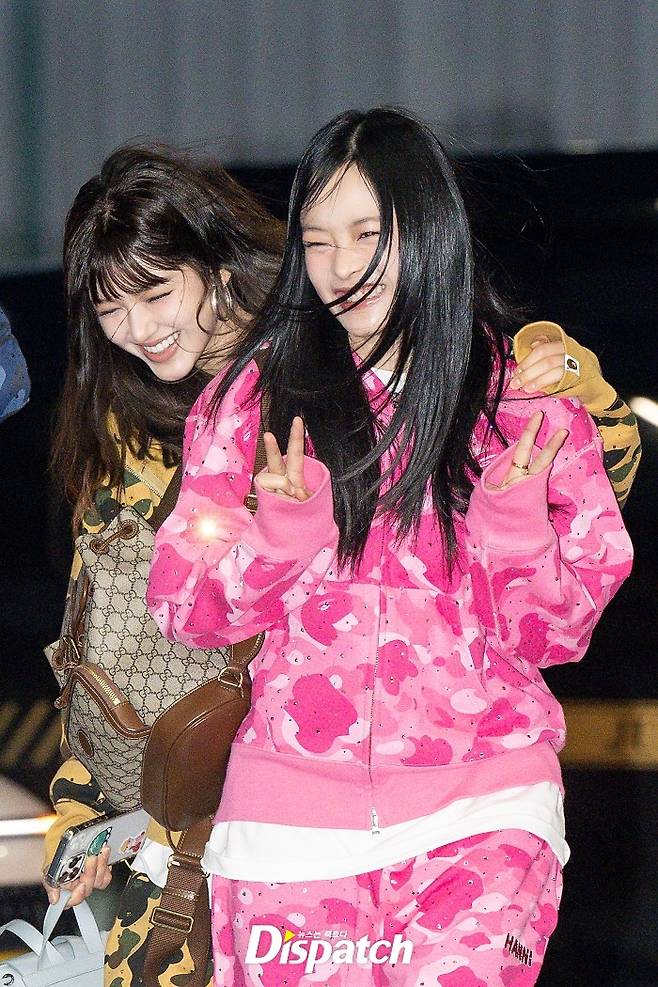 뉴진스는 컬러풀한 카모플라쥬 단체복으로 공항의 시선을 집중시켰다. 다니엘과 하니는 강추위에 서로를 끌어안으며 장난을 쳤다.