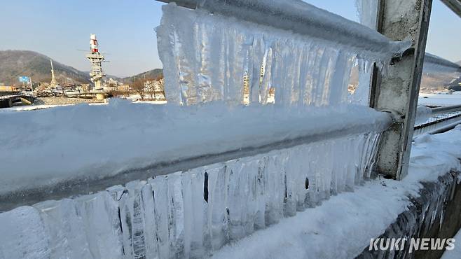 아침 기온이 영하권으로 뚝 떨어진 26일 오전 2025 화천산천어축제가 열리게 될 강원 화천군 화천천 인근에 고드름이 얼어있다.