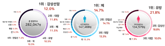 남자는 폐암-전립선암-대장암, 여자는 유방암-갑상선암-대장암 순으로 많았습니다.