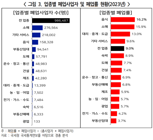 이번 조사는 법인사업자(130만 2000명)와 개인사업자(864만 8000명)를 합친 총사업자를 대상으로 실시됐다. 조사 결과 지난해 폐업률은 9%로 2022년에 비해 0.8%포인트 뛰며 7년 만에 상승 전환했다. 문을 닫은 사업자는 98만 6000명, 전체 사업자 10명 중 1명이 망했다. 이는 코로나19 펜데믹 당시인 2019명(92만 2000명)을 넘어서는 수치다. 폐업한 사업자 가운데 개인사업자만 91만 1000명으로 92.3%에 달했다.