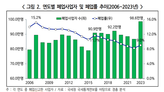 한국경영자총협회가 26일 발표한 ‘최근 폐업사업자 특징과 시사점’ 보고서에 따르면 지난해 폐업한 사업자는 98만 6000명으로 비교 가능한 통계가 작성된 2006년 이후 최대치를 기록했다.