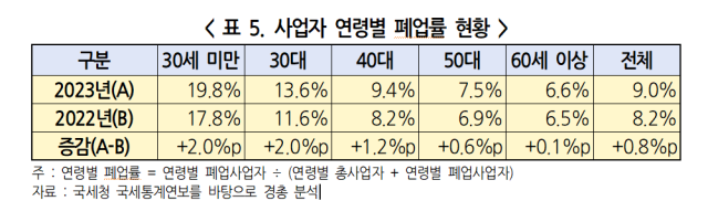 이번 조사에서 가장 눈에 띄는 부분은 다른 세대에 비해 높은 2030세대의 폐업률과 폐업 상황이다. 30세 미만, 소위 20대 사장님의 폐업률은 19.8%로 2022년(17.8%)에 비해 2%포인트 상승했다. 20대 사업자 5명 중 1명이 망했다는 뜻이다. 30대도 폐업률이 13.6%로 40대(9.4%), 50대(7.5%), 60세 이상(6.6%)에 비해 높았다.