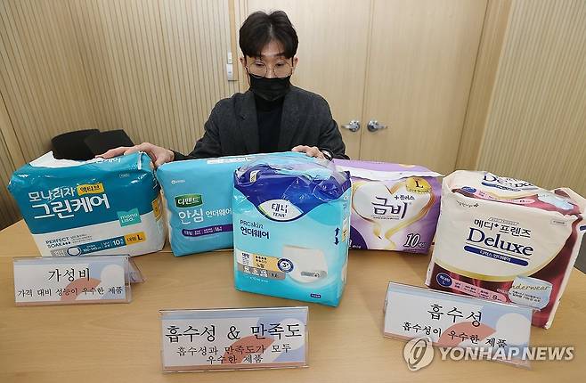 (서울=연합뉴스) 이재희 기자 = 26일 오전 서울 송파구 한국소비자원 서울강원지원에서 직원이 성인용 기저귀(팬티형) 품질비교 결과 브리핑에서 우수 제품을 공개하고 있다. 한국소비자원은 소비자 선호도가 높은 9개 브랜드의 제품 9종을 선정하여 흡수성, 안전성, 제품특징 등을 시험 평가했다. 2024.12.26
