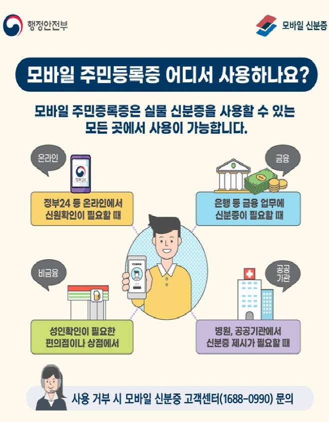 모바일 주민등록증은 주민등록법령에 따라 개인 스마트폰에 발급되는 법적 신분증으로, 기존 주민등록증을 소지한 모든 국민(최초 발급자 포함)이 신청할 수 있으며 공공기관과 금융기관, 편의점, 병원 등 다양한 곳에서 기존 주민등록증 대신 사용할 수 있다.