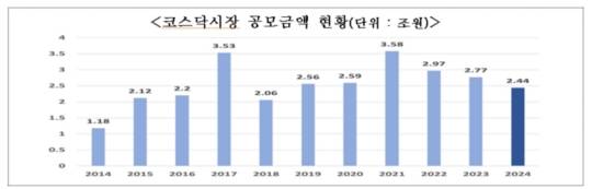 26일 한국거래소의 '2024년도 코스닥시장 신규상장 현황'에 따르면 올해 코스닥 신규상장을 통해 조달한 공모 금액은 2조 4,400억 원으로 집계됐다. 공모금액은 2021년(3조 5,800억 원) 이후 3년 연속 감소세를 나타내고 있다.