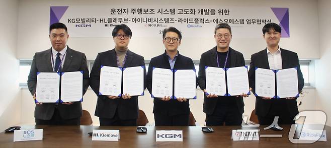 정지성 에스오에스랩(SOS Lab) 대표이사(왼쪽부터), 황준연 HL클레무브 AD 시스템 R&D 센터장, 이용헌 KGM 미래모빌리티센터장, 성득영 아이나비시스템즈 대표이사,박중희 라이드플럭스 대표이사가 이날 경기 평택 KGM 본사에서 열린 협약식에서 기념촬영을 하고 있다. (KGM 제공) 2024.12.26/뉴스1