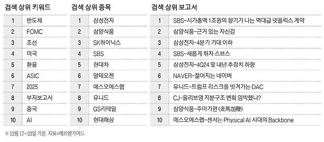 한 주간 투자자들의 이목이 쏠렸던 종목은 삼성전자, 삼양식품, SK하이닉스, SBS, 현대차 등으로 나타났다. 키워드 검색 순위에서는 반도체가 1위를 차지했고, 최근 12월 회의 결과를 내놓은 미국 연방공개시장위원회(FOMC)가 2위, 도널드 트럼프 수혜 업종으로 꼽히는 조선이 3위였다.