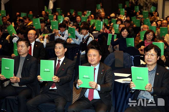 [청주=뉴시스] 26일 충북 청주시 용정동 S컨벤션에서 열린 충북도 탄소중립 한마당에서 김영환 충북지사를 비롯한 참석자들이 탄소중립 실천다짐 퍼포먼스를 하고 있다.