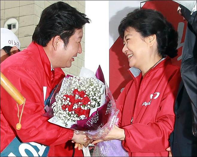 | ▲ 2012년 4월 10일, 당시 새누리당 박근혜 위원장이 19대 총선 지원 유세 후 노원을에 출마한 권영진 후보(현재 국회의원)와 만나 인사를 나누고 있다. |