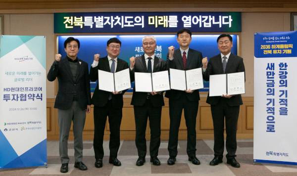 HD현대인프라코어는 26일 전북특별자치도청에서 전북도·군산시·한국산업단지공단과 ‘엔진 및 배터리팩 제조시설 건립을 위한 투자협약(MOU)’을 체결했다고 밝혔다.