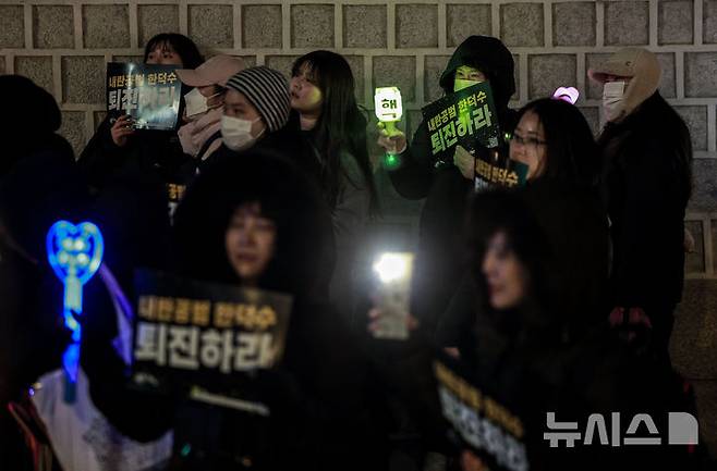 [서울=뉴시스] 정병혁 기자 = 26일 서울 종로구 정부서울청사 인근에서 열린 한덕수 퇴진 긴급행동 집회에 참석한 시민들이 구호를 외치고 있다. 2024.12.26. jhope@newsis.com