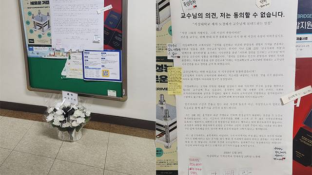 서강대 석사 과정생으로 본인을 소개한 필자는 대자보에서 “정의를 실천하고 인간 존엄성과 생명 가치를 존중하는, 사랑과 믿음을 갖춘 전인교육이라는 서강대의 교육이념에 위배되는 교수님의 시국선언을 보고 경악을 금치 못했다”고 썼습니다.