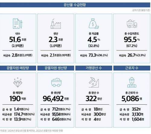 국내 광산물 연간 생산액 규모는 약 2조원 수준(2023년은 2조3000억원)으로 국내총생산의 0.1%를 차지하고 있다. 매출액 10억원 미만의 광산이 전체의 70%를 차지할 정도로 대부분 영세하다. 광산물의 95.5%(금액 기준)는 수입에 의존하는 등 자급률이 극히 낮은 수준이다.