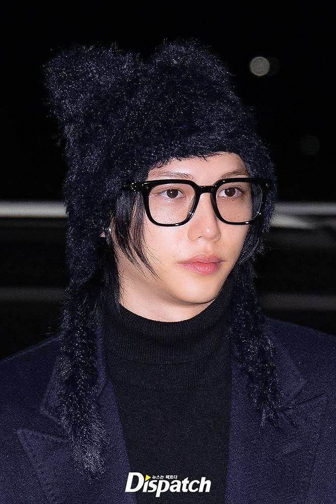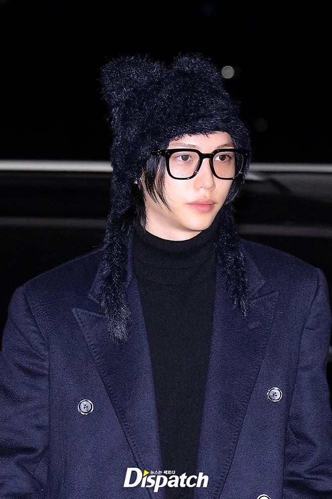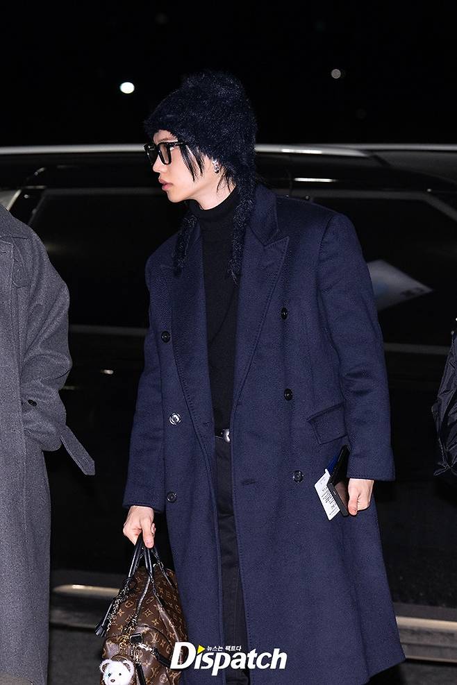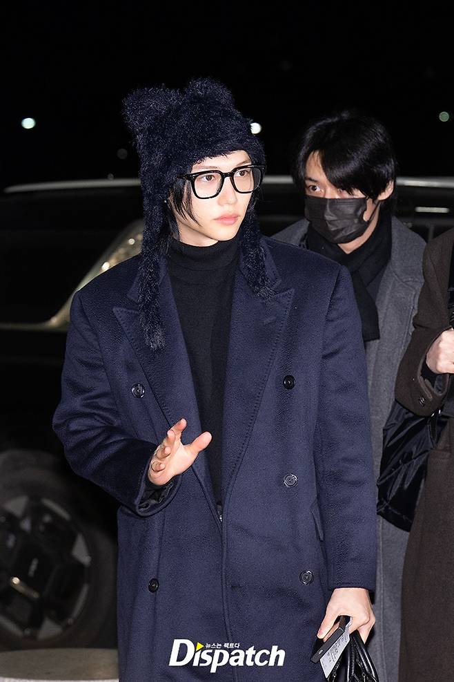 필릭스는 블랙 팬츠에 네이비 코트로 시크한 공항패션을 연출했다. 조각같은 비주얼이 돋보였다.