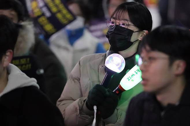 | ▲ 26일 저녁, 수원역 앞에서 수원시민들이 한덕수 대통령 권한대행이 헌법재판관 임명을 보류한 것에 분노하는 규탄 집회에서 한 청소년이 응원봉을 들고 구호를 외치고 있다. |