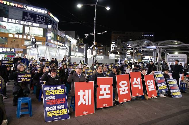 이날 수원·경기비상행동과 수원오산화성 촛불행동과 수원 시민들은 수원역 로데오거리 앞에서 "내란공범 국민의힘 해산, 윤석열 탄핵 즉각인용"을 촉구하고 나섰다.