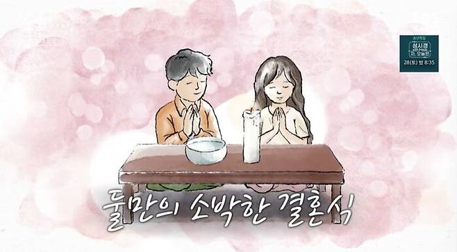 하지만 주변 사람들의 걱정은 기우였어. 두 사람은 냉수 한 그릇 떠 놓고, 그릇 옆에 초 하나를 세우고, 나란히 앉았어. 지금은 이렇게 소박하게 하지만, 나중에 돈 벌어서 멋진 결혼식을 하자고 약속하며, 그렇게 둘만의 작은 결혼식을 올렸어.