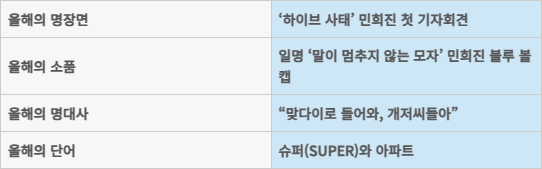 요약하자면 이 사태는 민희진의 대활극이다. 2024년 4월 25일은 대한민국 대중문화 역사상 길이 남을 혁명적 상황이 연출됐다. ‘경영권 찬탈’ 주역으로 낙인찍힌 민 전 대표는 ‘슈퍼 내추럴’(뉴진스 노래 제목)한 복장으로 첫 기자회견을 열고 온갖 유행어를 쏟아냈다. 뉴진스의 데뷔 과정부터 2030 여성들이 ‘극혐’하는 중년 남성들의 만행도 폭로했다. “골프나 치고 술이나 마시는” 하이브의 임원들을 언급하면서다. “저 직장인이에요. 이 개저씨들”이라며 육두문자가 쏟아내는 순간 사안의 중대성, 사건의 진실과는 무관한 카타르시스를 경험했다는 ‘진짜’ 직장인들이 수두룩 했다. 멋드러지게 긴 칼을 휘저은 민희진의 퍼포먼스는 각종 밈과 짤로 SNS를 뒤엎었다. 그날 착용한 MLB의 파란 모자는 품절 대란이 빚어졌다. 일명 ‘말이 멈추지 않는 모자’, ‘프레젠테이션 잘하는 모자’라는 수사까지 붙었다.