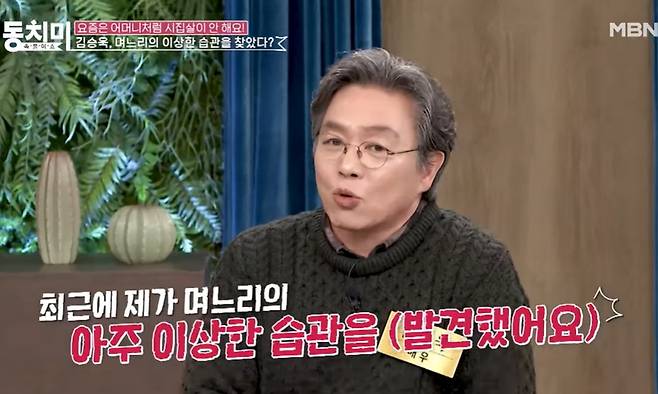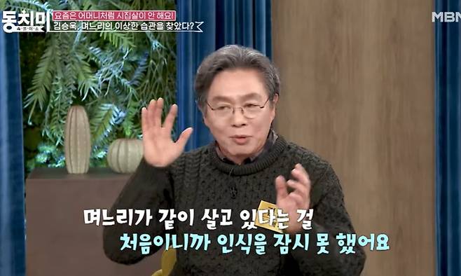 [TV리포트=김현서 기자] 배우 김승욱이 며느리의 이상한 습관을 폭로했다. 오는 28일 오후 방송될 MBN '속풀이쇼 동치미'에서는 '요즘은 어머니처럼 시집살이 안 해요'라는 주제로 이야기를 나눈다.
