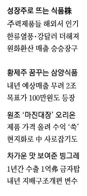 불닭볶음면(삼양식품)으로 한 끼 식사에 꼬북칩(오리온)으로 간식하고 나면 메로나(빙그레)로 입가심한다. 부지불식간 K푸드가 전 세계인의 입맛을 사로잡고 있다. 이들 식품 주식 '삼총사'는 그동안 치열하게 내수 시장에서 싸우며 경쟁력을 키우더니 이젠 수출 중심의 '성장주'로 우뚝 섰다. 올해에 이어 내년에도 사상 최고 실적을 기록할 것이란 증권가 전망이 그 대표 증거다. 최근 식품주 삼총사에 대한 실적 추정치가 상승하고 있는 것은 핵심 제품이 미국·중국·인도를 넘어 유럽 등 글로벌 식품 소비시장을 석권하고 있어서다. 여기에 계속된 한류 열풍과 최근 도드라진 달러화 강세로 원화 환산 매출이 급증하는 '승수효과'가 더해지고 있다. 최근 여의도 증권가에서 반도체나 자동차 등 전통 성장주 대신 식품주를 성장주 포트폴리오에 넣으라고 권고하는 이유다.