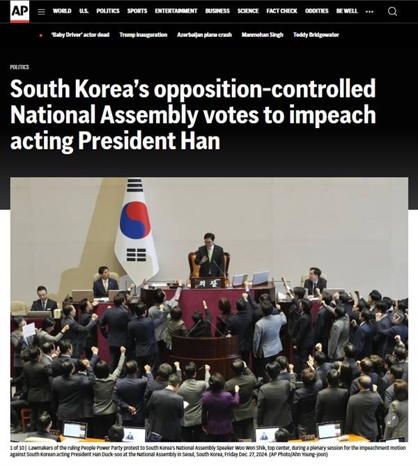 AP통신은 "야당이 주도하는 한국 국회가 여당의 격렬한 반대에도 한 권한대행의 탄핵안을 통과시켰다"라며 "윤 대통령의 충격적인 계엄령 선포와 탄핵으로 촉발된 한국의 정치적 위기가 더욱 심화했다"라고 보도했다.