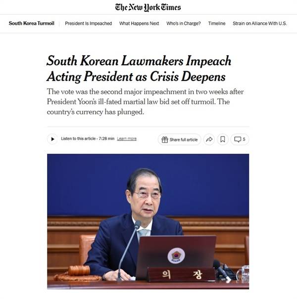 | ▲ 한덕수 대통령 권한대행 국무총리의 탄핵소추안 가결 소식을 보도하는 뉴욕타임스 |