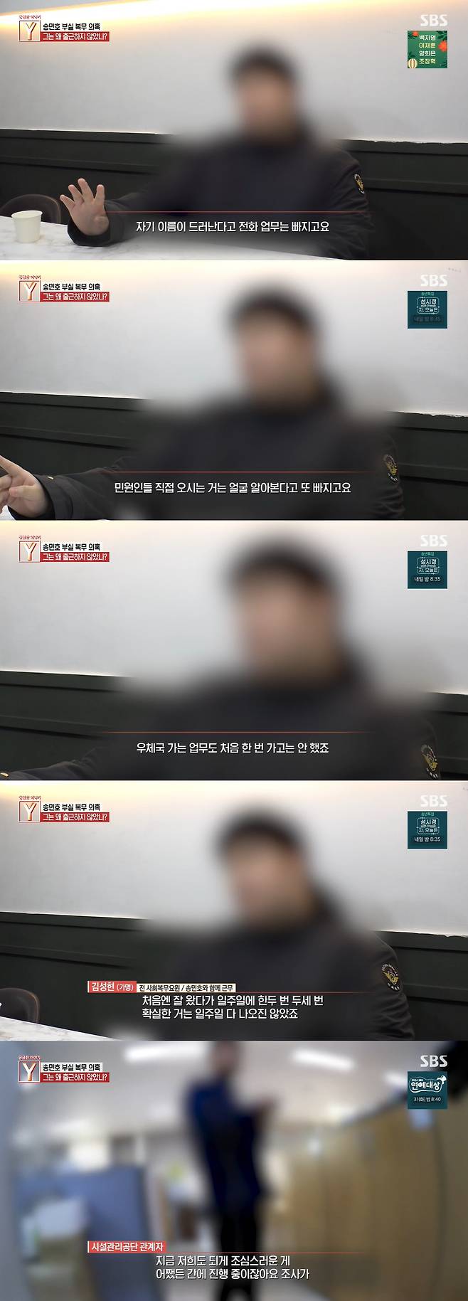 시설관리공단 관계자는 송민호의 근무 태만 의혹에 대해 묻자 "조사가 진행 중이라 조심스럽다"라며 말을 아꼈고 제작진은 "단순한 부분이다. 출근을 했다, 안 했다는 단순한 부분을 말해달라는 것"이라고 짚었다. 관계자는 "그 부분은 저희가 여기서 더 이상 똑같은 말씀을 드릴 수밖에 없다는 걸 이해해달라"라며 같은 입장을 되풀이했다.