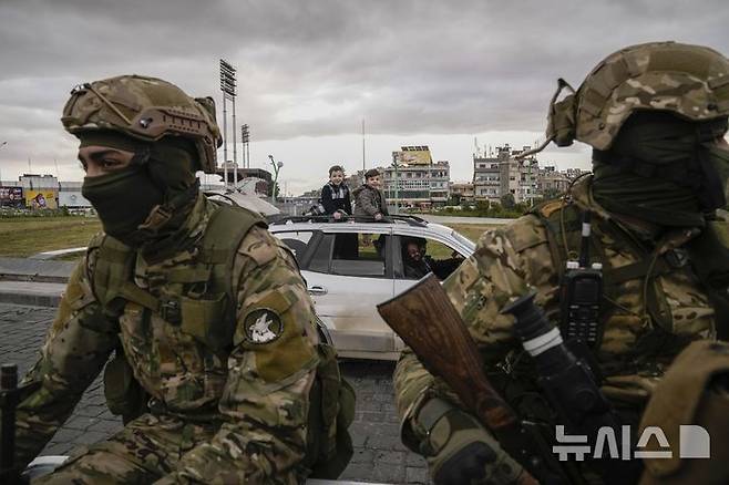[다마스쿠스=AP/뉴시스] 바샤르 아사드 정권을 전복하고 새로운 시리아 정규군에 재편된 전직 반군 출신 전투원들이 27일(현지시각) 다마스쿠스 도심에서 열리는 군사 퍼레이드를 준비하는 가운데, 차량에 탑승한 소년들이 이들을 웃으면서 바라보고 있다. 2024.12.28.