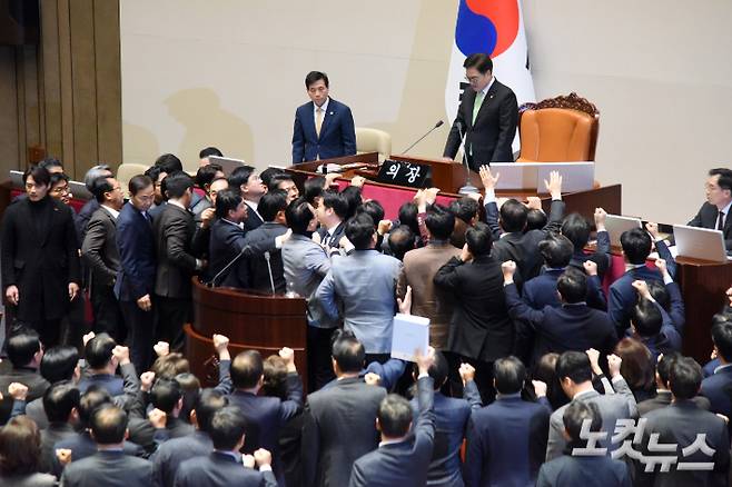 표결에 앞서 우원식 국회의장이 권한대행 탄핵소추 가결 의결정족수를 151석으로 정하자 국민의힘 의원들은 집단 반발한 뒤 퇴장했다.
