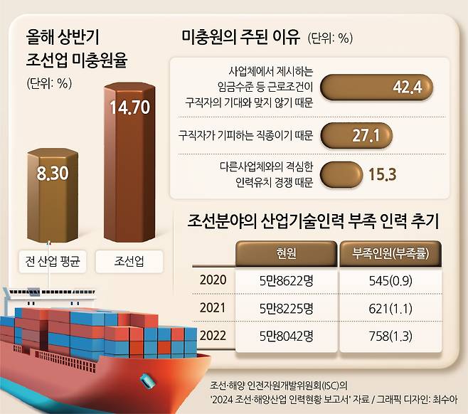 29일 한국조선해양플랜트협회 조선·해양 인적자원개발위원회(ISC)가 최근 발간한 ‘2024 조선·해양산업 인력현황 보고서’에 따르면, 올해 상반기 조선 업종의 미충원율은 14.7%에 달했다. 전산업 평균(8.3%)의 두배에 조금 못미치는 수준이다. 지속적인 외국인 인력 유입에도 공급 제약이 여전히 남아있는 셈이다.