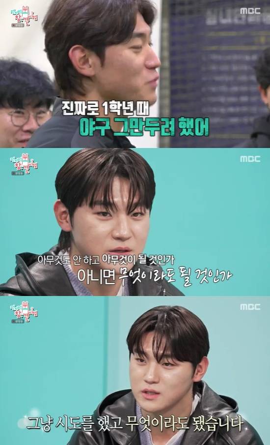 당시 부상을 당해 야구를 쉬어야 할 수도 있었던 상황이었다고. 그는 "고등학교는 시즌이 짧으니까 뭐라도 해서 보여줘야 하니까 아픈데도 그냥 했다. 심적으로 많이 힘들었다"라고 고백했다. 포기하지 않을 수 있었던 원동력을 묻자 그는 "명언 모음집을 많이 봤다. 좋은 글귀를 휴대전화에 두고 많이 본다. 기억에 남는 글귀가 '아무것도 안 하고 아무것이 될 것인가. 아니면 무엇이라도 될 것인가."라며 인상깊었던 문구를 공유했다.