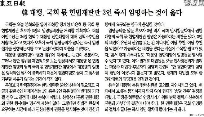 “한 대행, 국회 몫 헌법재판관 3인 즉시 임명하는 것이 옳다”(동아일보)