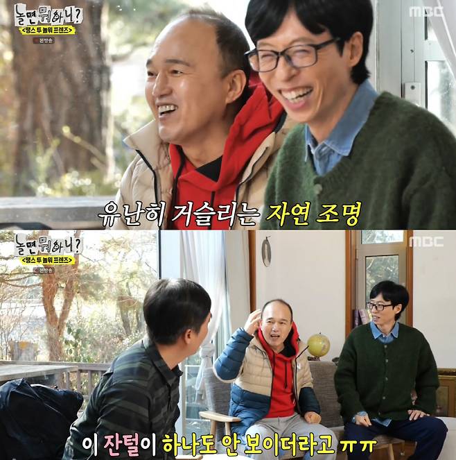 곧이어 연말 파티 장소에 도착한 세 사람. 김광규가 모자를 벗자 유재석은 잔털이 보송한 그의 머리에 "훨씬 더 좋아졌다. 머리카락이 많이 났다"며 깜짝 놀랐다.