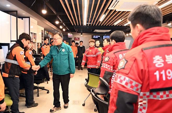 [서울=뉴시스] 이한경 행정안전부 재난안전관리본부장이 지난 28일 충북 청주동부소방서를 방문해 겨울철 대비 화재예방대책 추진 중인 직원들을 격려하고 있다. (사진=행정안전부) 2024.12.29. photo@newsis.com *재판매 및 DB 금지