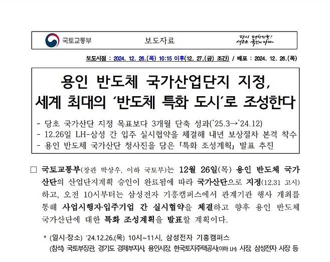| ▲ 용인 반도체 국가산업단지 지정에 대한 국토부의 보도자료. |
