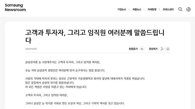 | ▲ 3분기 실적과 함께 발표한 삼성전자의 사과문. |