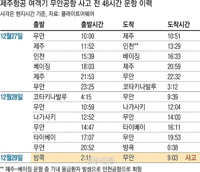 사고기, 최근 48시간 동안 13차례 운항…제주항공 “기체 이상징후 없었다”[제주항공 여객기 참사]