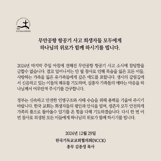 한국기독교교회협의회는 29일, 총무 김종생 목사 명의의 애도 메시지를 발표하고 "무안공항 항공기 사고 희생자들 모두에게 하나님의 위로가 함께 하시기를 빈다"고 밝혔다.