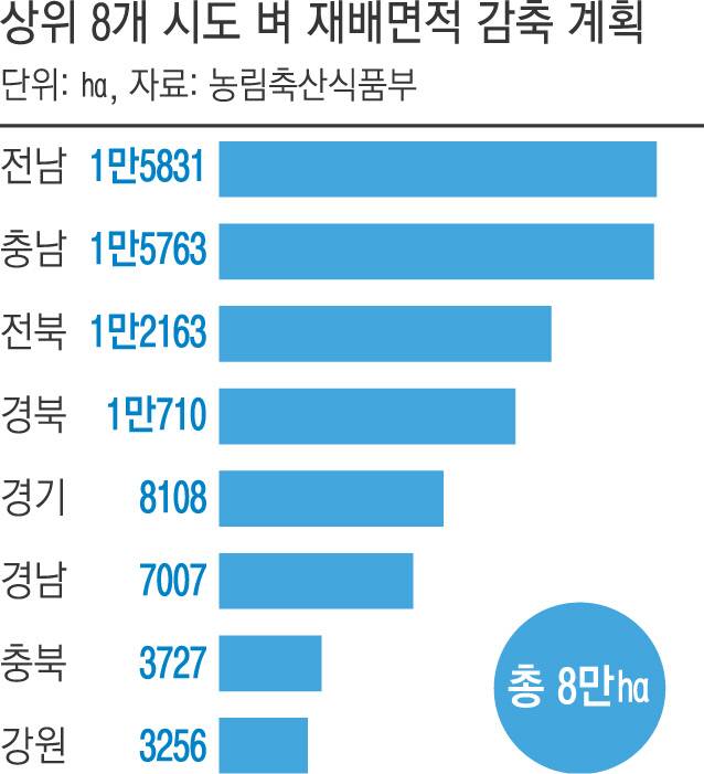 쌀 공급과잉 문제를 해소하기 위한 정부의 ‘벼 재배면적 8만㏊ 감축’ 계획에 따라 올해 쌀 생산량 1위인 전남이 가장 많은 1만5800여㏊ 재배면적을 줄이게 됐다.