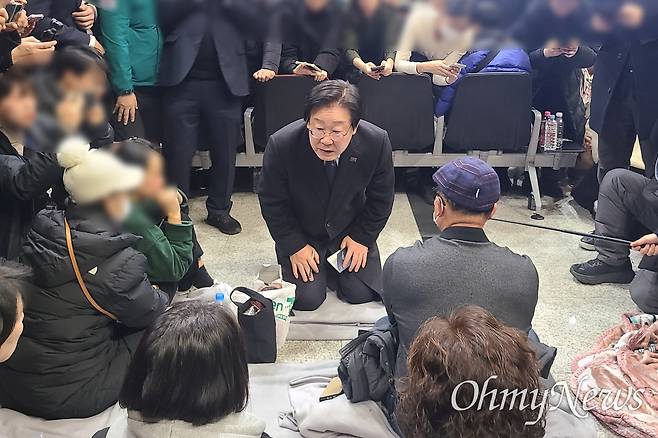 어두운 계열의 정장 차림을 한 이 대표는 29일 오후 8시 30분께 유족 대기실이 있는 전남 무안국제공항 2층 대합실을 찾았다. 침통한 표정의 이 대표는 무릎을 꿇은 채 유족들과 손을 맞잡고 대화를 나눴다.