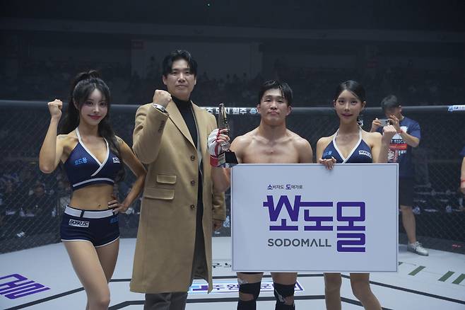 소도몰 강태구 본부장이 29일 원주 치악체육관에서 열린 굽네 ROAD FC 071 -65㎏ 계약체중 매치에서 승리한 박민수에게 트로피를 시상한 뒤 기념촬영을 하고 있다. 사진제공=로드FC
