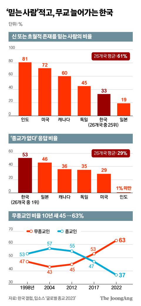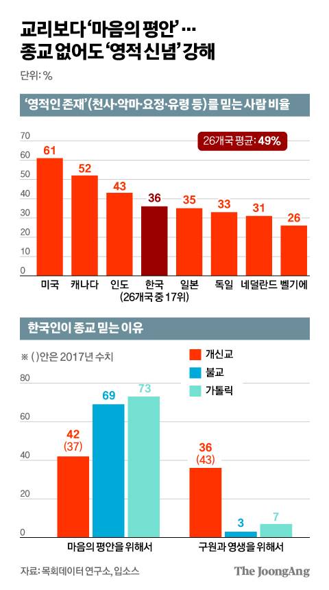 주목할 것은 한국인의 종교적 성향이 이와 무관치 않다는 점이다. 글로벌 리서치 기업 입소스의 종교 인구 조사에 따르면 한국은 ‘종교가 없다’고 응답한 비율(53%)이 주요 26개국 중 1위다. 신의 존재를 믿는 한국인의 비율은 33%에 불과해 일본에 이어 두번째로 낮았다. 목회데이터연구소의 ‘2023 한국인의 종교생활과 신앙의식 조사’에 따르면 종교를 갖는 이유도 윤회·구원·영생 같은 특정 교리보다 ‘마음의 평안을 위해’라는 응답이 3대 종교 모두 가장 높았다. 특히 개신교에서 1998년 조사 이래 신앙 이유 1위를 지켜온 구원과 영생(36%)을 제치고 마음의 평안(42%)이 처음 올라섰다. 무속 신앙이 파고들 정서적 토대가 조성돼있는 셈이다.