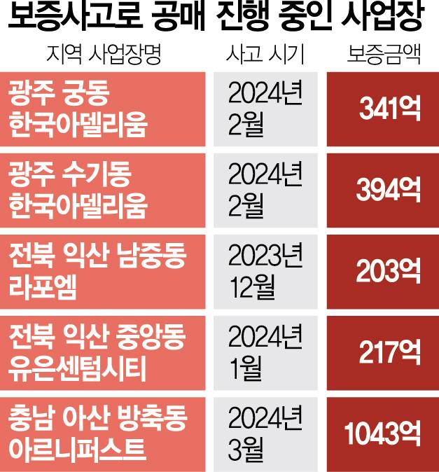 공매에 넘어갈 사업장은 추가될 전망이다. 지난달 보증사고가 발생한 경남 ‘통영 더유엘 지역주택조합’과 ‘경북 구미 그랑포레 데시앙 1BL’, 이달 보증사고가 발생한 전북 익산 ‘남중동 제일오투그란데’ 등이 대표적이다. HUG는 이들 사업장의 수분양자들에게 분양 혹은 환급 이행 여부를 결정하도록 하고 있다. 수분양자들이 환급이행을 선택할 경우 HUG는 이들에게 그간 지급한 계약금과 중도금을 시행사 대신 돌려줘야 한다.